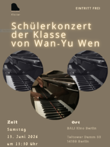 Schülerkonzert (Klavier)der Klasse von Wan-Yu WenSamstag, 13. Juni 2026, 13.30 Uhr Eintritt frei