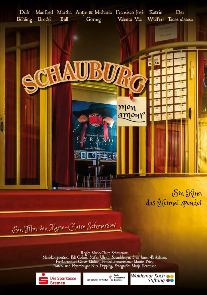 Schauburg, mon amourAnschließende Diskussion mit Filmemacherin Marie-Claire Schmarsow …begleitet vom Zerreißen der Kinokarten, dem Rattern des Vorhangs, dem Surren des Kinoprojektors und dem Klirren der Kaffeetassen sowie den Vibrationen der vorbeifahrenden Straßenbahn erzählen unsere ProtagonistInnen – von treuen BesucherInnen, kreativen und führenden Köpfen – Anekdoten aus dem ältesten Kino Bremens.Die Regisseurin Marie-Claire Schmarsow nimmt uns mit auf ein oder zwei Gläser Wein und malt die unterschiedlichen Farben eines Kinos, das nicht nur ein Kulturort ist, sondern ebenfalls ein sozialer Treffpunkt. Licht aus und Vorhang auf: |