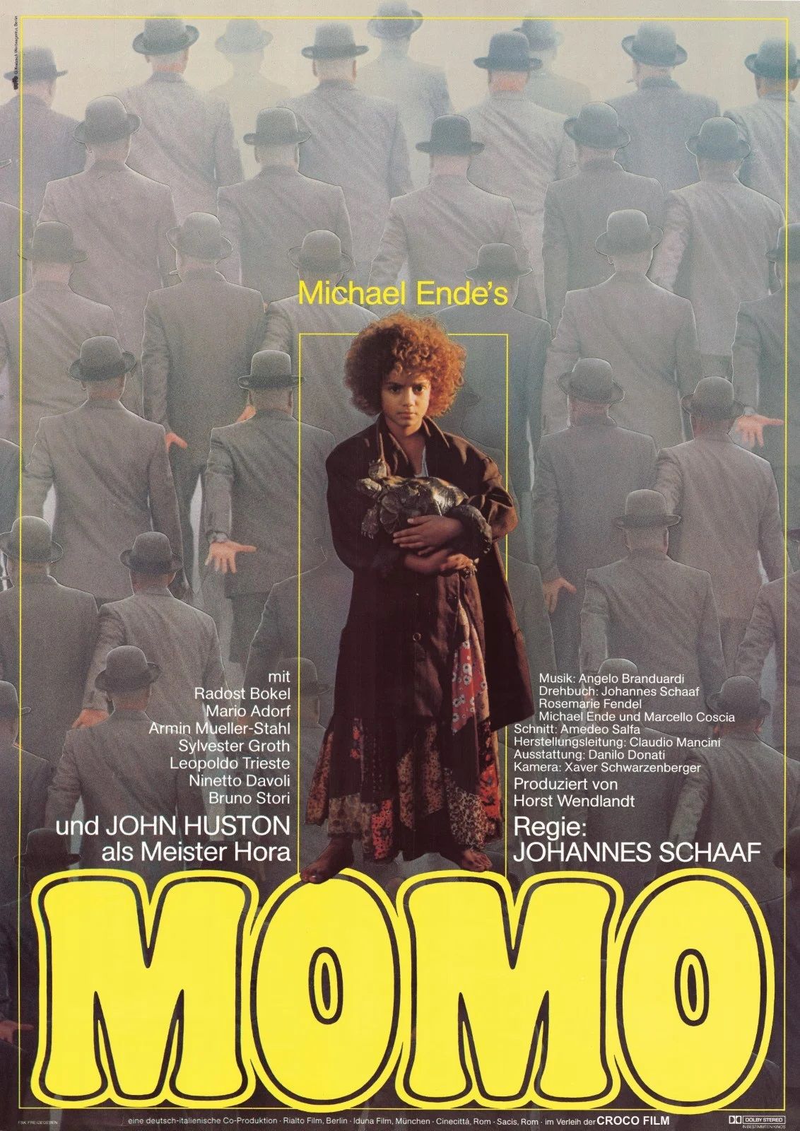 Das Waisenmädchen Momo lebt allein mit seiner Schildkröte Kassiopeia in einem riesigen Amphitheater und hat viele Freunde. Doch eines Tages hat niemand mehr Zeit. Alle sind von der Idee besessen, ungenutzte Zeit für ein längeres Leben zu sparen. Mysteriöse graue Herren mit Aktenkoffern wollen den Menschen mit verklausulierten Verträgen die Zeit stehlen und diese für ihre eigenen Zwecke benutzen. Mit Hilfe ihrer Schildkröte und einer Stundenblume stellt Momo sich den Zeitdieben entgegen.